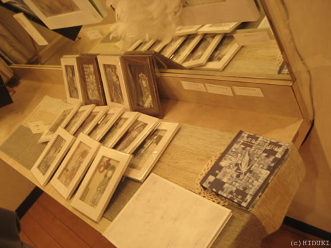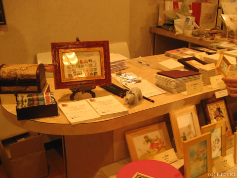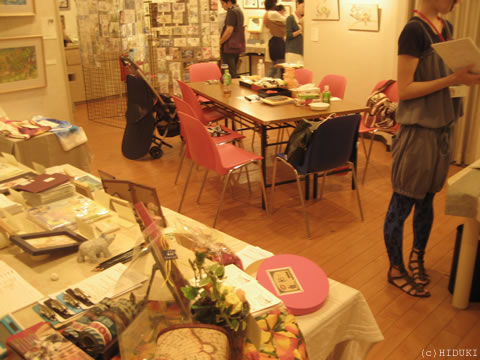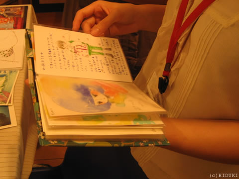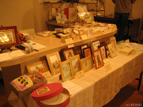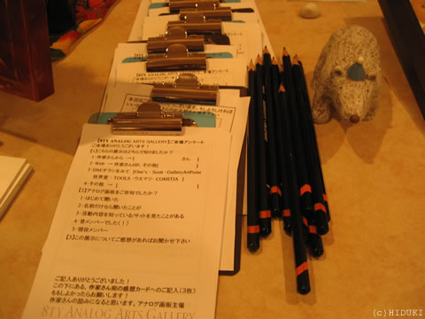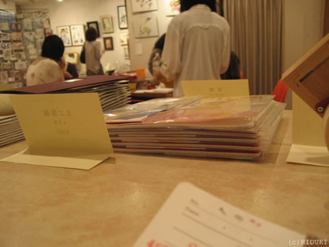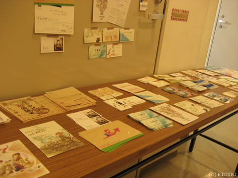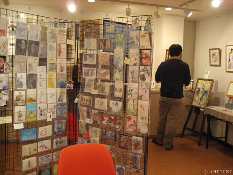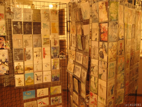 2010.9.19 Sun. / 二日日を終えました。 本日は12時の開場とともにお客さまが来てくださいました。 ご来場いただいた方に書いていただくアンケート /置物のくまが売れそうになりました。 昨年にひきつづき、今回も100点近いアナログ原画が飾られています。作品数は昨年の100点越えに届かず、今年は98作品のようです。でも大きな作品が多かったり、半立体の作品もあったり、おしゃれに展示していただいたりと、「昨年よりパワーアップしていますね」「作品も増えましたね」などという御感想が多いです。ぜひ堪能していっていただけたらと思います。 会場中央には、テープルと机と、お菓子と原画展ラクガキ帳を置いてございます。ぜひゆっくりお絵描きしていっていただけたら嬉しいです。 ポストカードコーナー / 約200種類ものポストカードがずらり