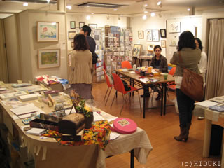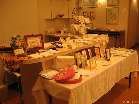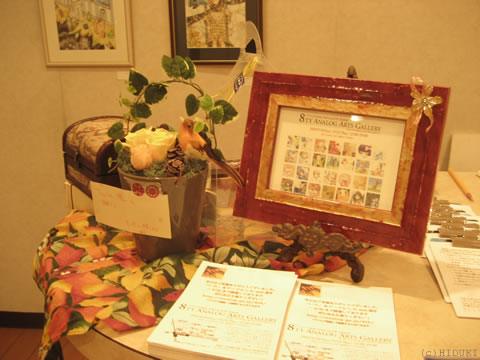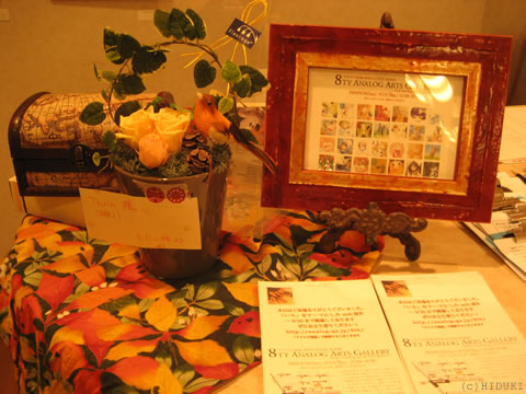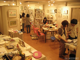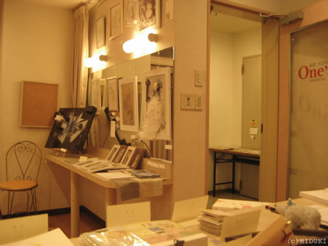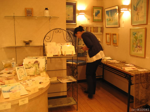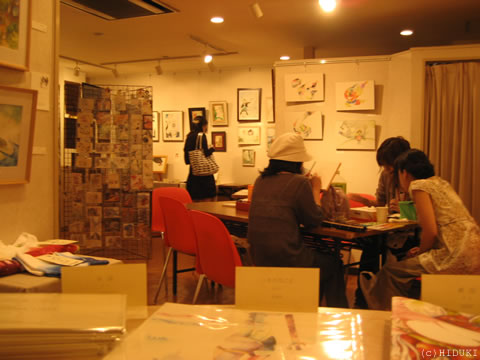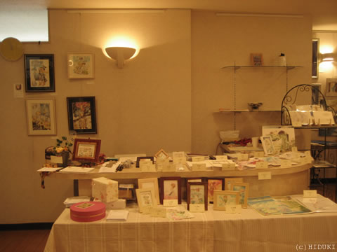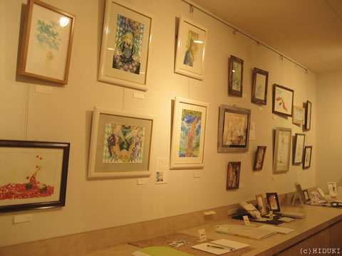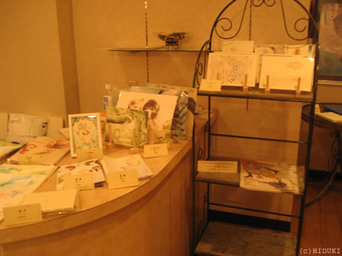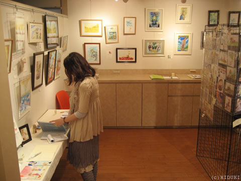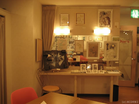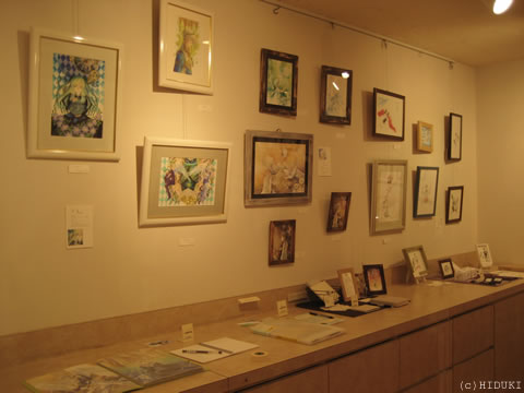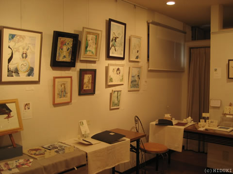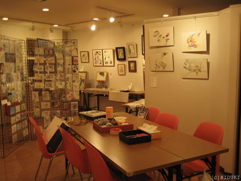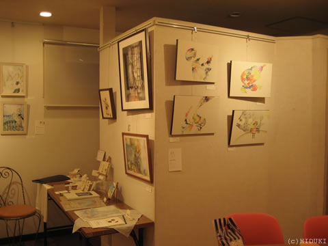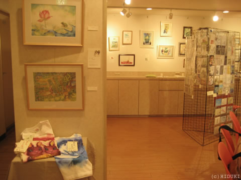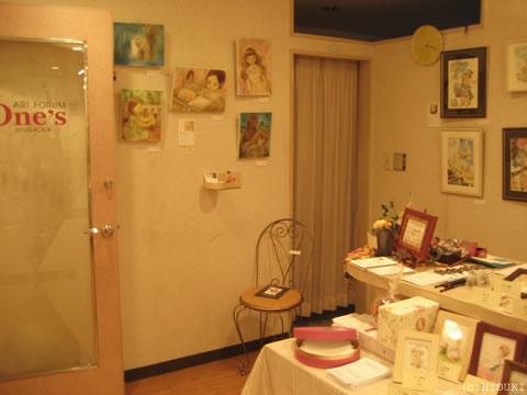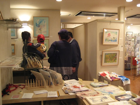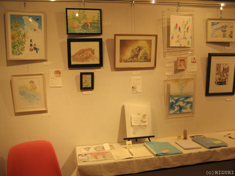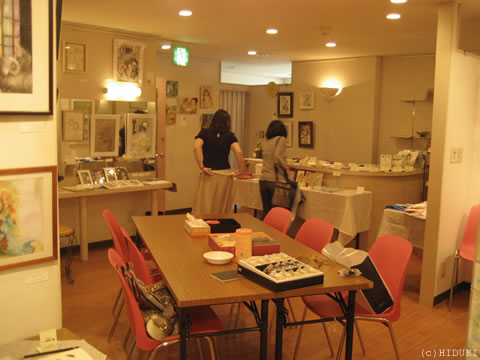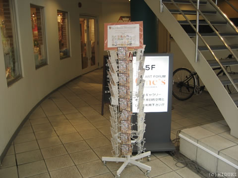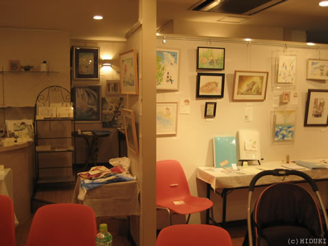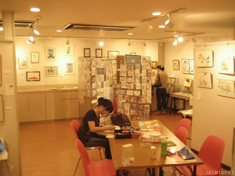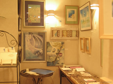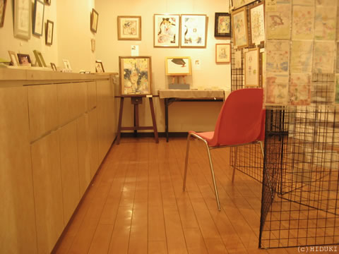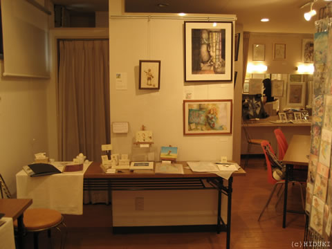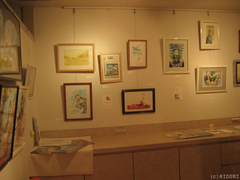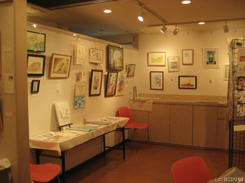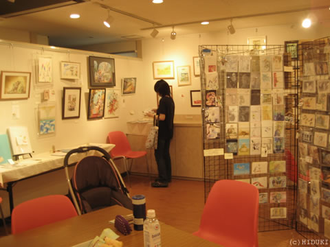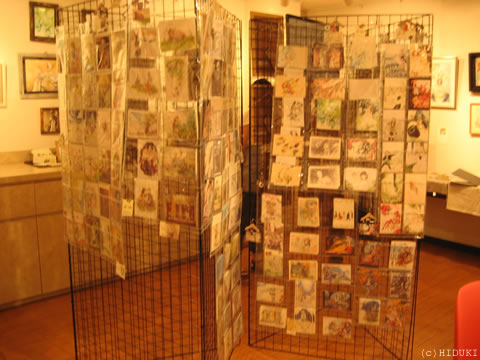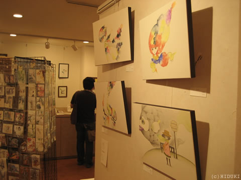 2010.9.20 Mon. / 三日日を終えました。 自由が丘の駅に降り立つと、空は暗くてあいにくの雨模様でした。原画展、初めての雨です。でも開場時間の12時になると、雨は止んでからっと晴れてきました。 写真もいっぱい撮ってきました。それでは100作品たちを、ぐるり巡ってみたいと思います。 階段もありますが、奥のエレベーターで5階へ上がります。エレベーターを降りると… 入り口です 入ってすぐ展示が始まります 受付を過ぎて、右へ 奥まったコーナーにも作品が飾られています ここをぐるっと裏側へ回り込みます 道の両側に絵のあるゾーンを抜けて、奥へ進みます お帰りの際は、外の名刺・フライヤーコーナーにも是非お立ち寄りください すべてご自由にお持ち帰りいただけます 中へ戻りましょう。 おまけ。あれはなに、と皆さんが不思議に思っているのは、マグカップ型スピーカーです。BGMはここから流れています