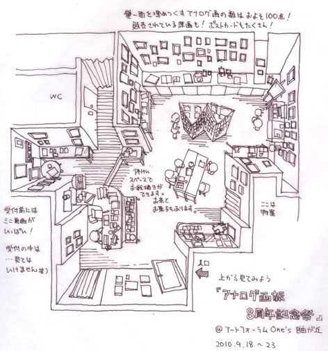 2010.9.22 Wed. / 五日日を終えました。 残すところあと二日! 平日二日めの様子をお送りします。 ご来場の方にはフライヤースペシャルバージョンを差し上げています 会場俯瞰図。イコさんのラクガキを頂きました 地図左下、受付の裏の主催スペースにPCを持ち込んで、web展の更新を。 8周年記念祭ですが、原画展と平行して、web展も開催中です。本日最後の更新で、原画展の新作を含む17作品を掲載いたしました。「いろ」をテーマに、総勢30名、70を越える作品が集まりました。こちらもぜひご覧ください。 明日、いよいよ最終日。100を越えるアナログ作品に出会えるアナログ原画展、明日は12時開場、閉場は17時となります。ショップコーナーは16時まで。是非お越しください! |