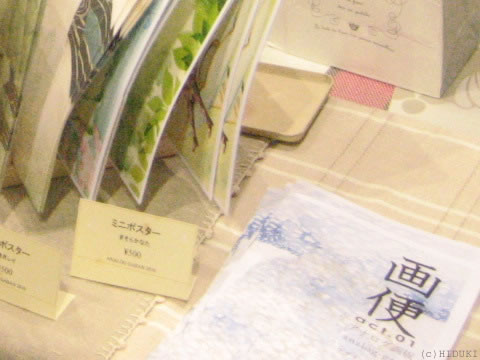 時間はあっという間に過ぎていきます。15時を過ぎる頃、せっかくの新作、せっかくの原画なので、もっと近くで見ていただきたくて、配置換えを試みます。販売物を片側にまとめてみました。原画への距離が近付いたでしょうか。